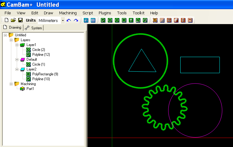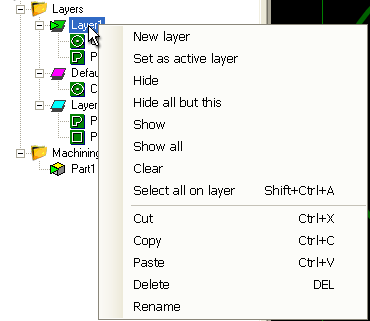 When drawing new shapes, they will be inserted into the layer marked as the Active layer, which is indicated in the drawing tree by a small green arrow icon. The active layer is set by right clicking a layer in the drawing tree, then selecting Set as active layer.