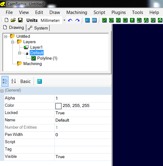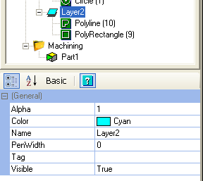 Selecting a layer in the drawing tree allows its properties to be altered in the property grid. The appearance of the layers, such as colour and line widths, can be set in this way.