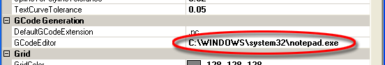 In the following example, Windows notepad has been defined as the gcode editor.