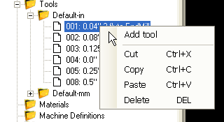 If no tool library is specified in the drawing, the default libraries will be searched for entries of this tool number. The default libraries are labeled ‘Default-in’ and ‘Default-mm’, where the units of the current drawing will be used to choose the correct library according to the ‘-in’ or ‘-mm’ suffix.