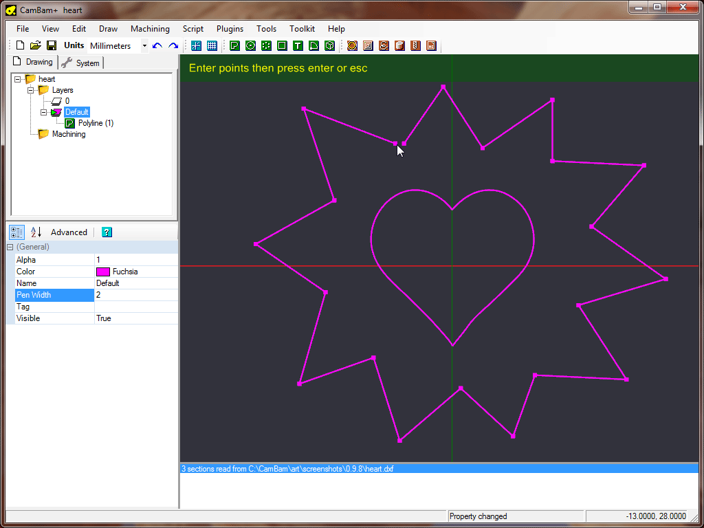 Use the polyline drawing tool Draw Polyline to draw a random shape around the heart. This will form the outer boundaries of an island pocket. For the last point, press the C key to close the shape, or click on the first polyline point (the cursor should snap to it), then press ENTER or click the middle mouse button.