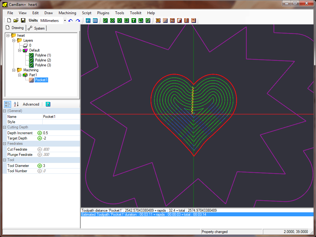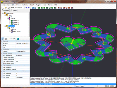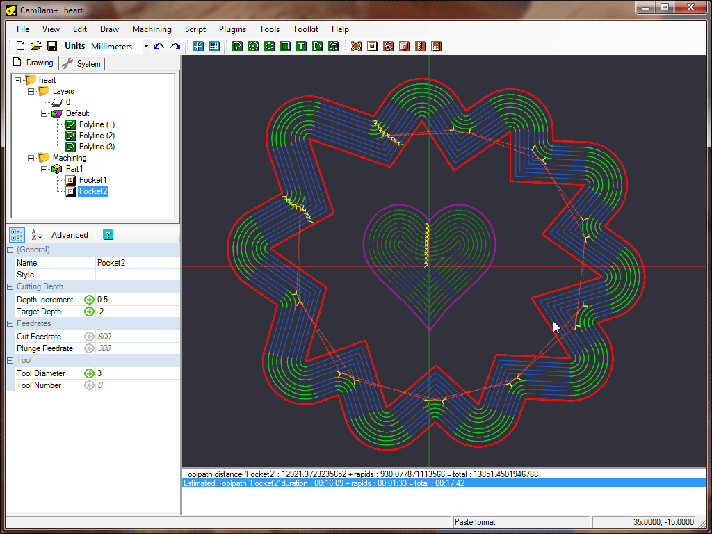 Select the heart shape then insert a pocket machine operation using the pocket tool CAM Pocket MOP. For pocketing basics, please see the Stepper Mount tutorial in Getting Started.