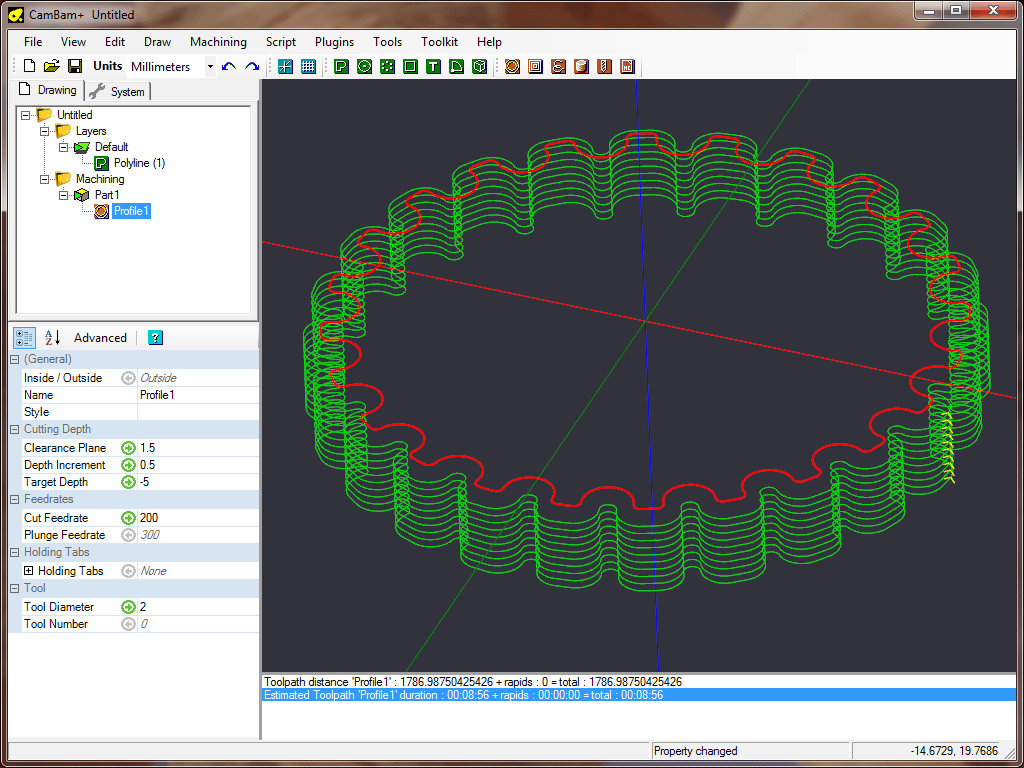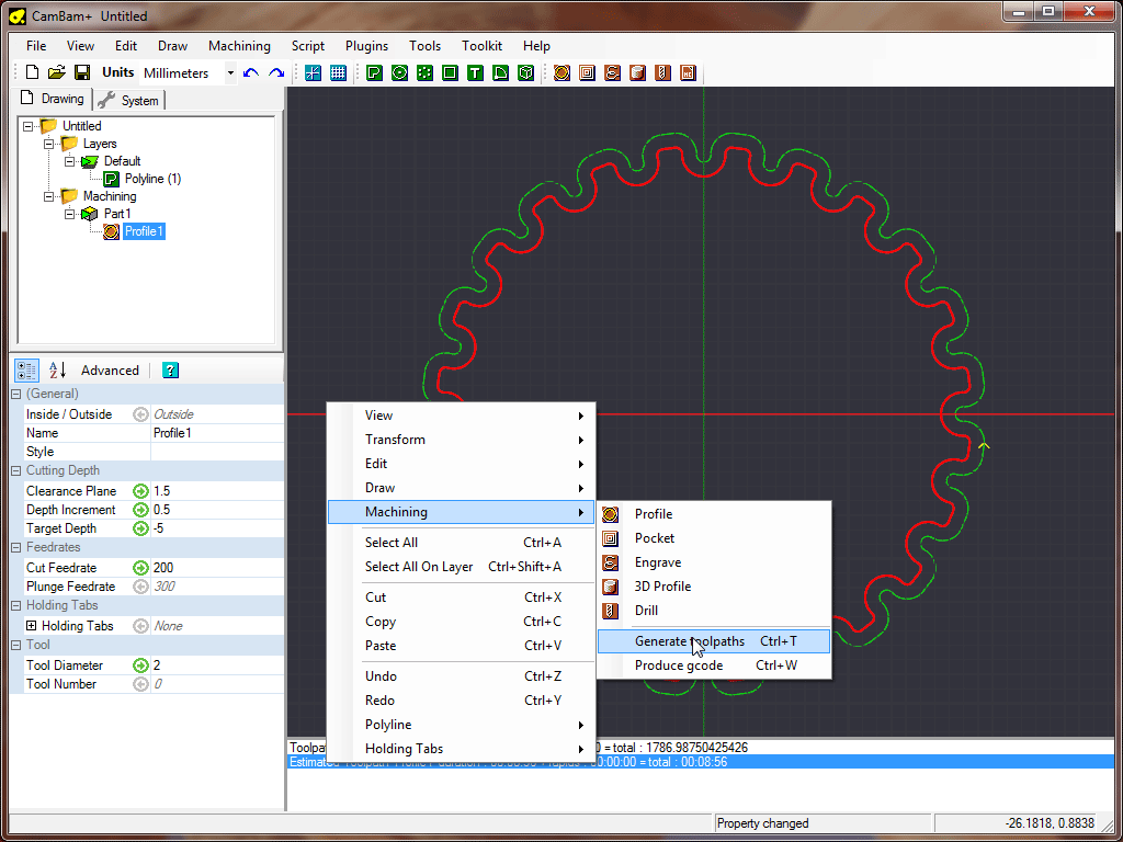 Generate the resulting toolpath for the profile; right click the drawing to bring up the drawing context menu, then select Machine - Generate Toolpaths.